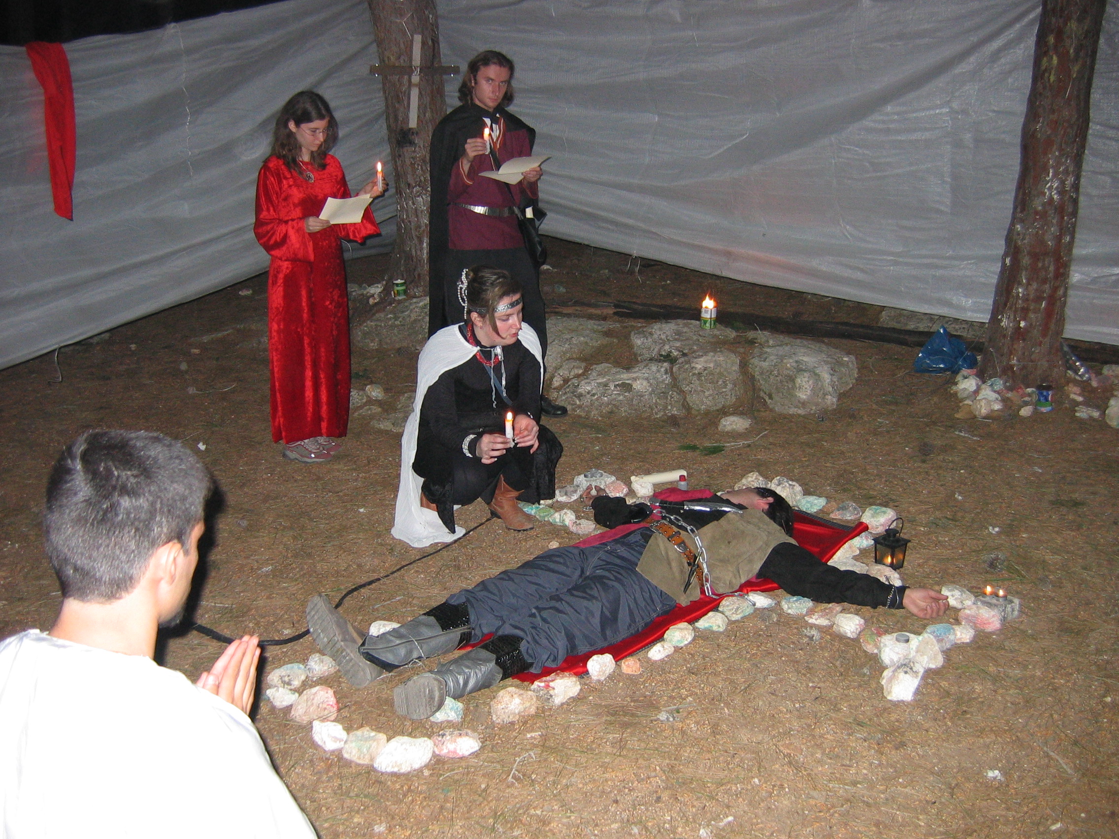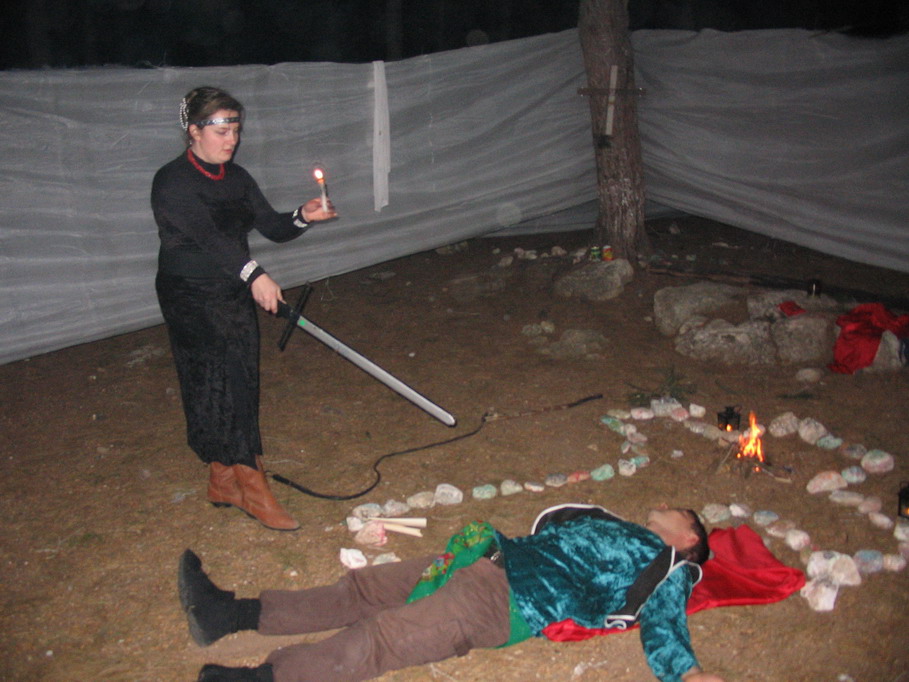 П.с. Кстати я забыла три вещи: Во первых потомок схета тоесть Схет респект за одеяние. Второе Цамици зачем вы его бедного так пытали и жертву он классно отыграл, мне от его криков уши даже болели по всему полигону было слышно, молодец. А в третьих: Гангриэлы интересный и красивый ритуал, жаль что Асамиты вам так бесцеремонно помешали...